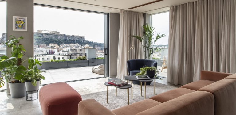 Guests enjoy the tailored experience of staying in a building with a history and character that has been respectfully preserved by the clarity and apparent simplicity of its new layout and spatial distribution and enhanced by balancing the austerity of the old with the elegance of the new. This stunning penthouse suite on the top-floor has incomparable 360 degree views that include the Acropolis and Mount Lycabettus. It boasts two bedrooms, a living room and panoramic terrace with a swimming pool and a Jacuzzi. The two bedrooms have king size beds and for entertaining, besides a huge private terrace, there’s a spacious living room as well as a dining table for 8. The sleek bathroom is fitted out with a rain shower, bathtub and heavenly bath amenities. High quality designer furniture combined with custom-designed furniture by K-Studio, contemporary Greek art and well-thought out details.